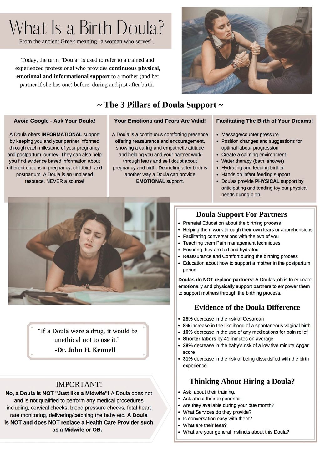 “A doula is a professional trained in childbirth who provides emotional, physical, and educational support to a mother who is expecting, is experiencing labor, or has recently given birth. The doula’s purpose is to help women have a safe, memorable, and empowering birthing experience.”